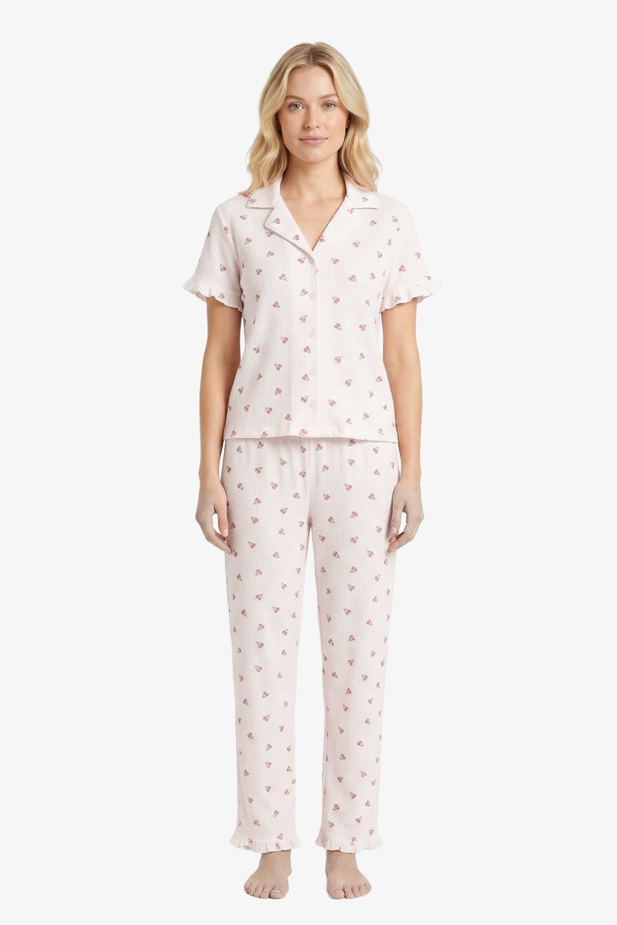 Hem görünümü hem de pratik kullanımıyla öne çıkan bu desenli kadın pijama takımı, konforu ve zahmetsiz şıklığı bir arada arayanlar için ideal bir seçimdir.