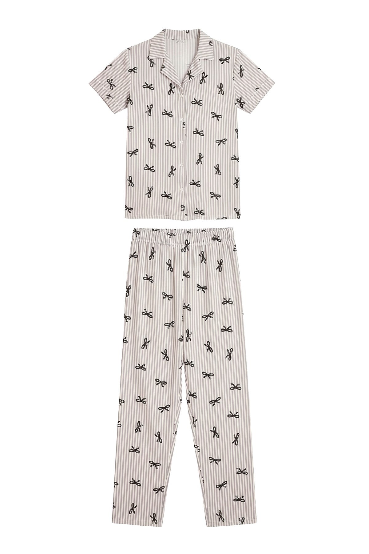 Gri Çizgi Desenli Yumuşak Dokulu Gömlek Yaka Kadın Pijama Takımı (CH15273506GR)