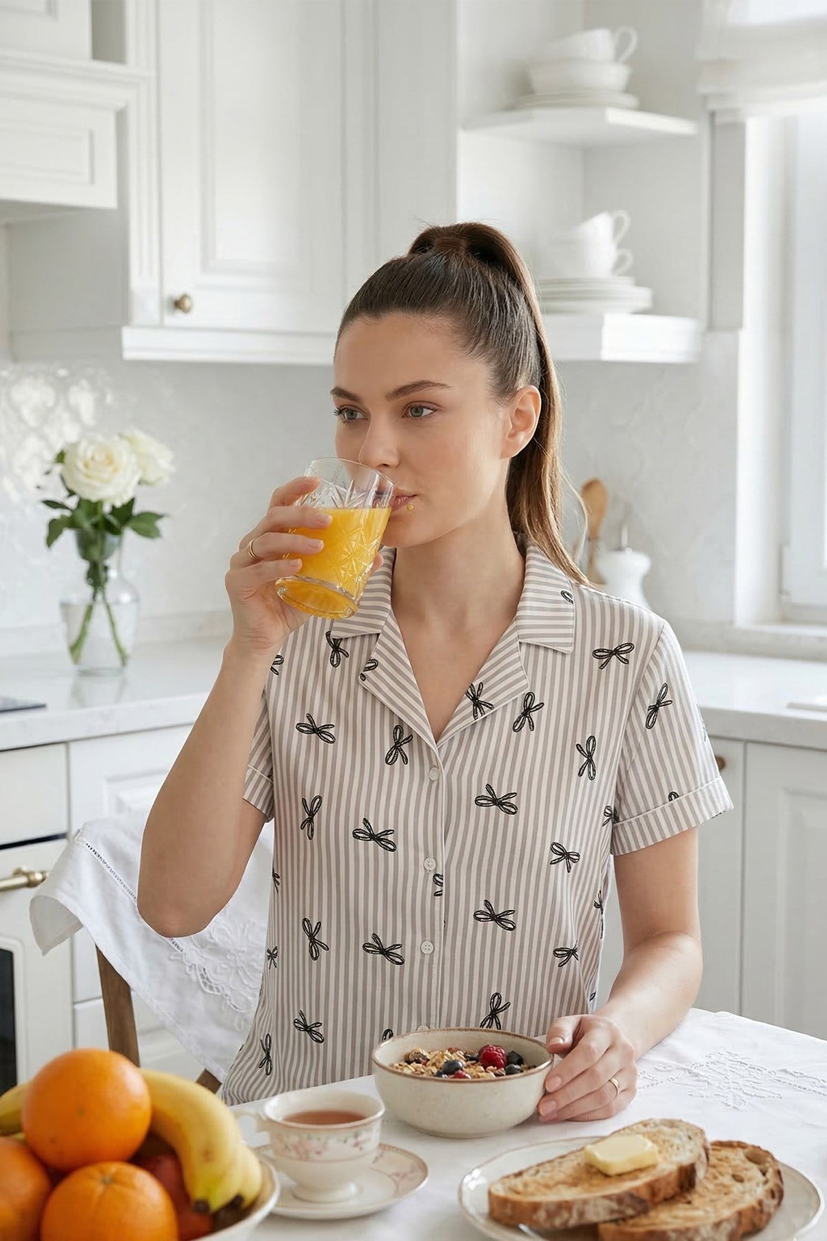 Gömlek yaka tasarımı sayesinde klasik ve her dönem tercih edilebilecek bir stil sunan bu kadın pijama takımı, uzun alt formu ile bütünlüklü ve şık bir siluet oluşturur. İnce çizgi ve zarif desen detayları, ürüne modern ve temiz bir görünüm kazandırırken, günlük kullanımda estetik bir duruş sağlar.
