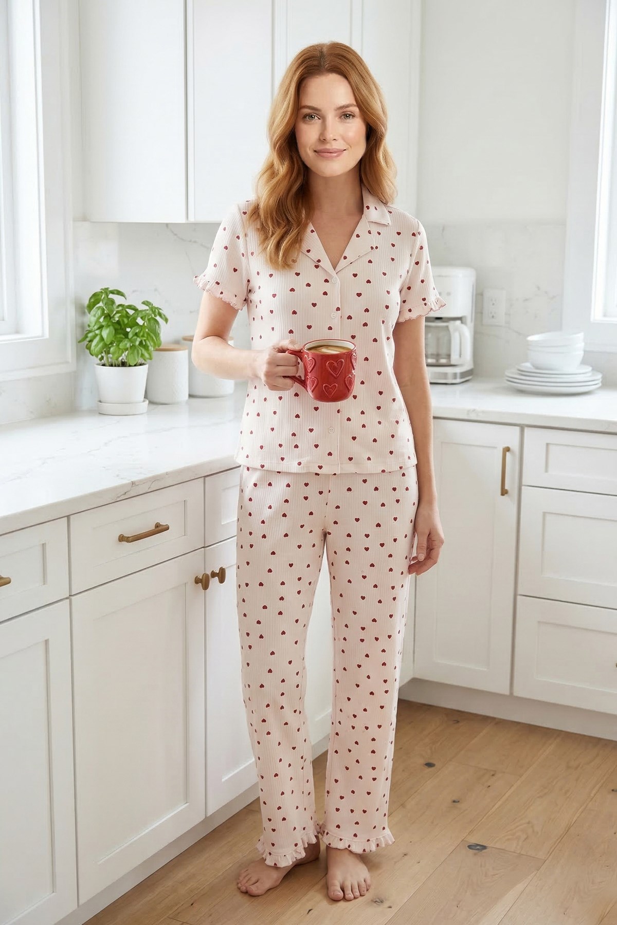 Hem görünümü hem de pratik kullanımıyla öne çıkan bu desenli kadın pijama takımı, konforu ve zahmetsiz şıklığı bir arada arayanlar için ideal bir seçimdir.