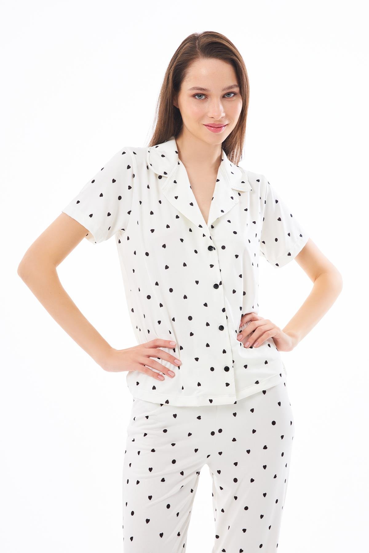 Premium Kadın Pijama Takımı Krem Kalp Desenli Yumuşak Dokulu Kısa Kollu Gömlek Yaka (CH15183505KMKALP)