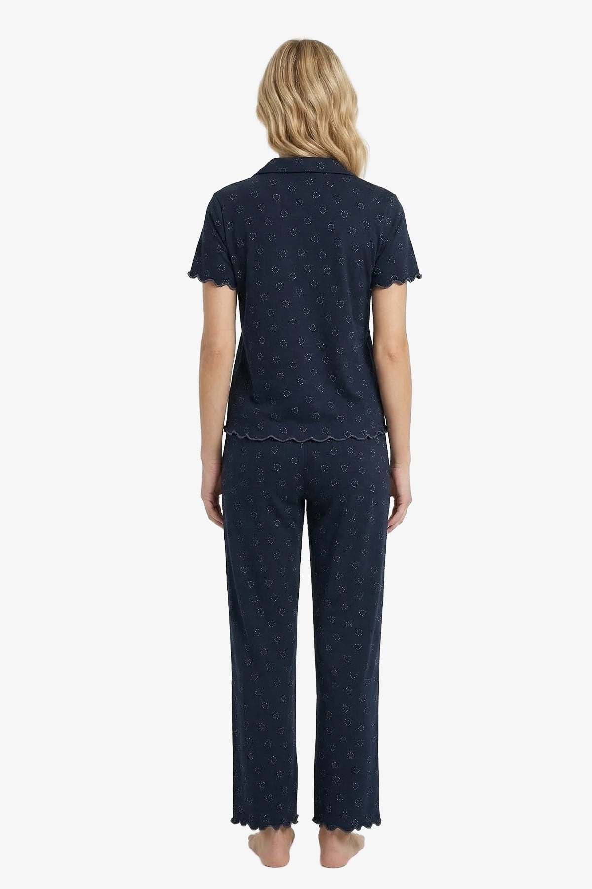 Gömlek yaka tasarımı sayesinde klasik ve her dönem tercih edilebilecek bir stil sunan bu kadın pijama takımı, uzun alt formu ile bütünlüklü ve şık bir siluet oluşturur. İnce çizgi ve zarif desen detayları, ürüne modern ve temiz bir görünüm kazandırırken, günlük kullanımda estetik bir duruş sağlar.