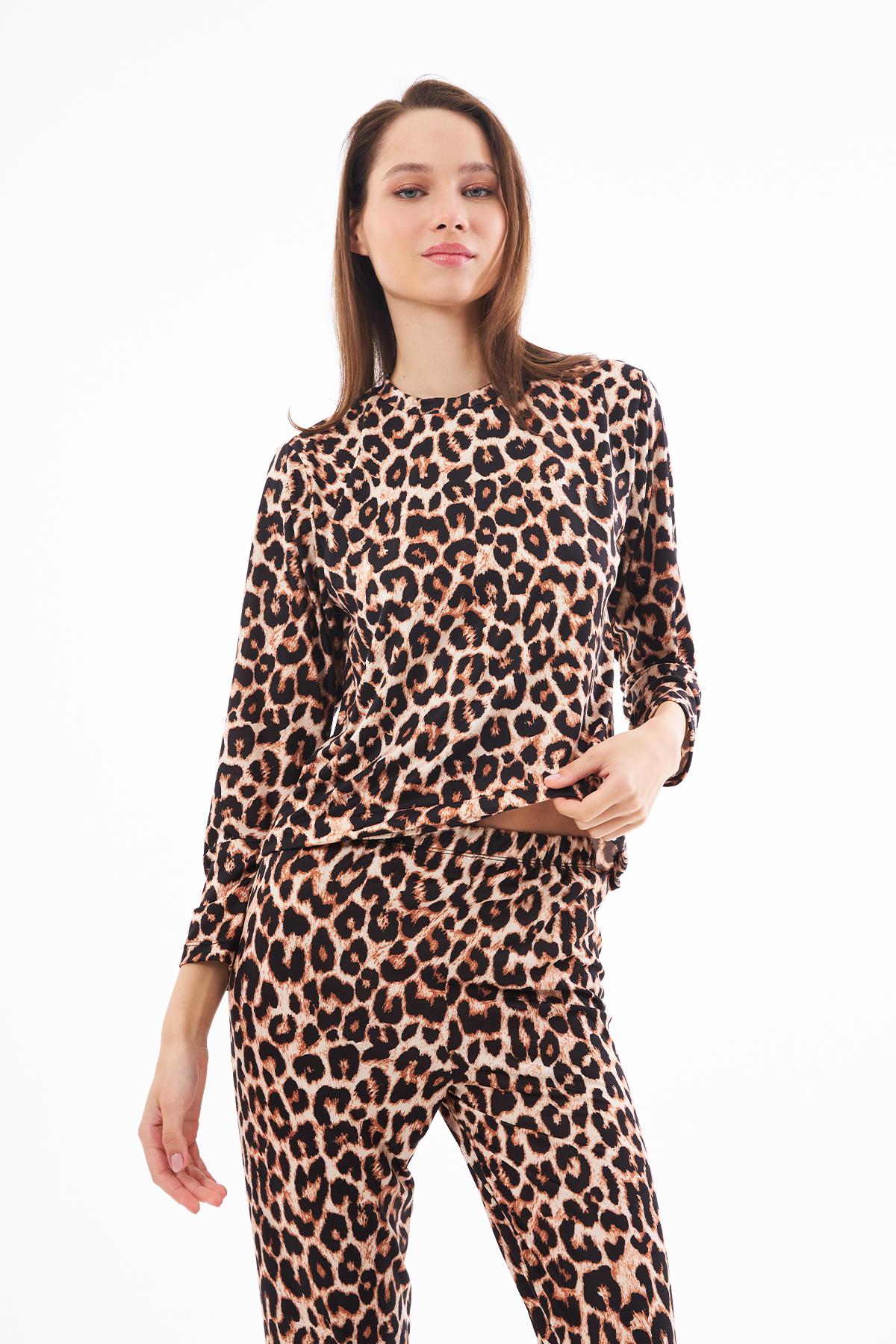 Premium Kadın Pijama Takımı Leopar Desenli Yumuşak Dokulu Bisiklet Yaka Uzun Kollu (CH15203505LEOPAR)