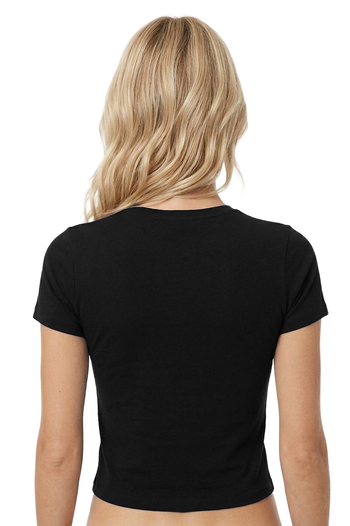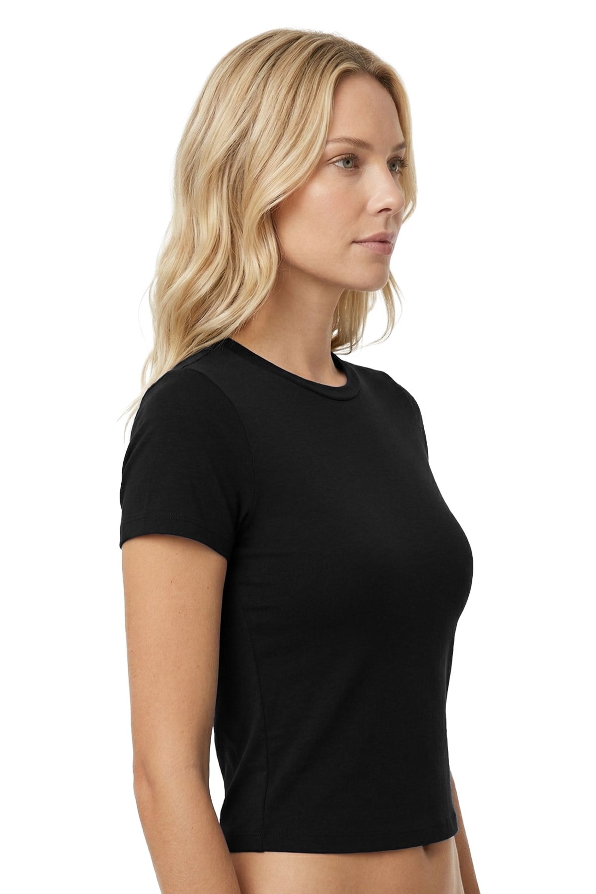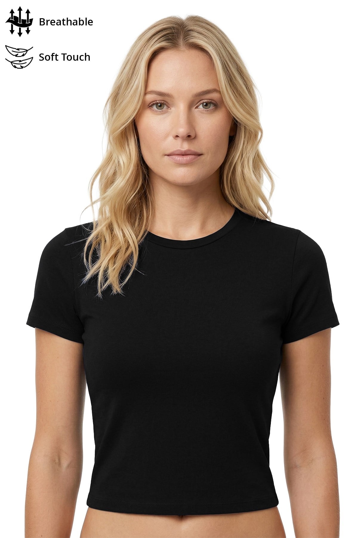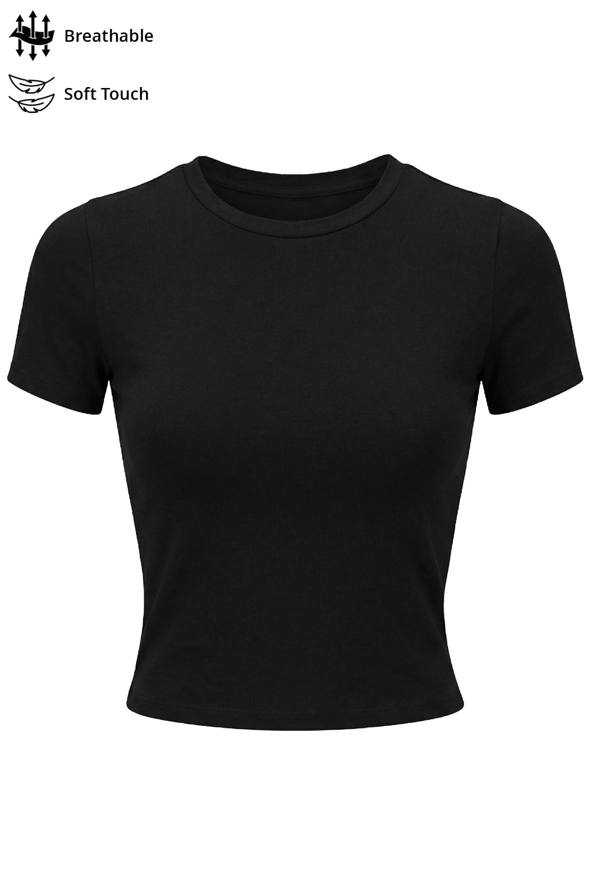 Siyah Viskon Bedene Oturan Bisiklet Yaka Kısa Kollu Kadın Crop Tişört (CH30033704SY)