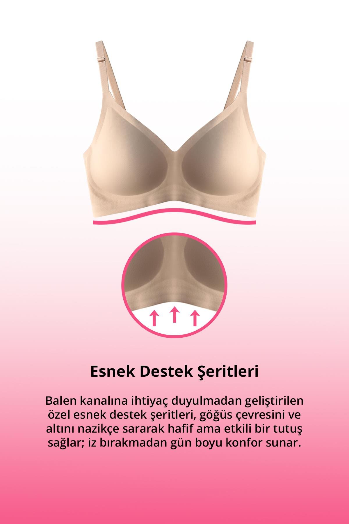 Balen kanalına ihtiyaç duyulmadan geliştirilen özel esnek destek şeritleri, göğüs çevresini ve altını nazikçe sararak hafif ama etkili bir tutuş sağlar; iz bırakmadan gün boyu konfor sunar.