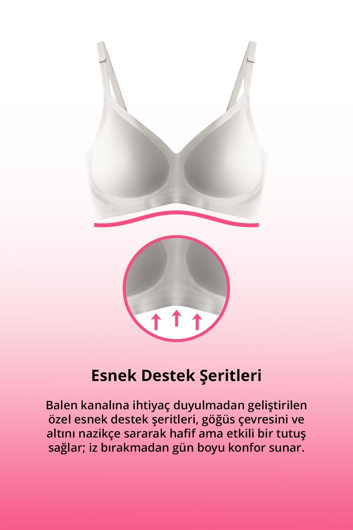 Balen kanalına ihtiyaç duyulmadan geliştirilen özel esnek destek şeritleri, göğüs çevresini ve altını nazikçe sararak hafif ama etkili bir tutuş sağlar; iz bırakmadan gün boyu konfor sunar.