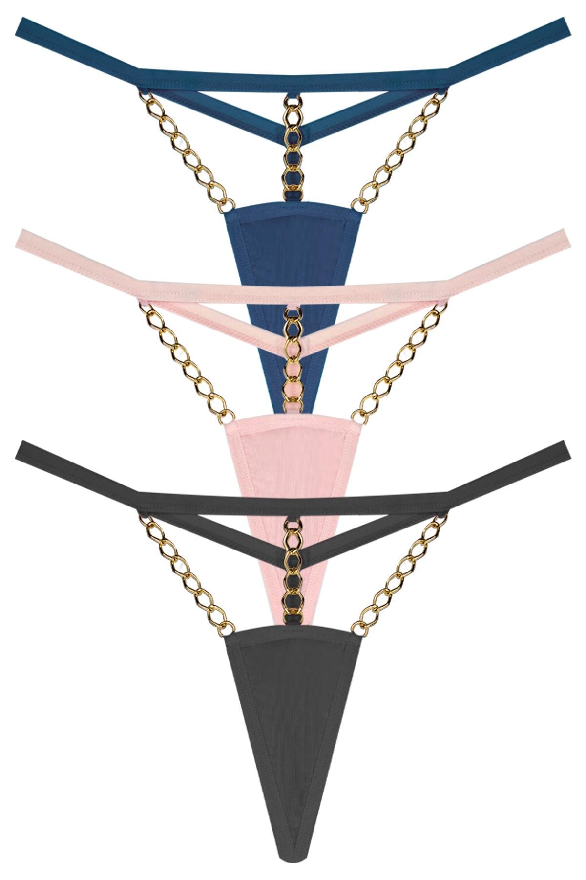 Tüllü Zincir Detaylı Kadın String Külot 3'lü Paket